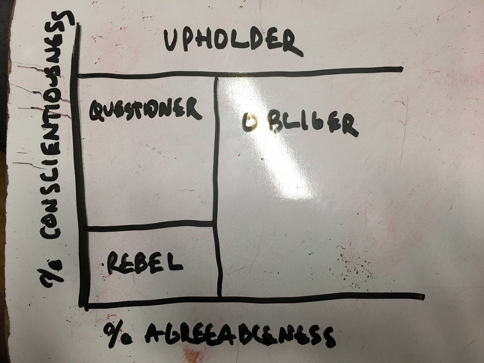 I would also posit that we could include a Z-axis on the above graph with “% Openness” as the axis. I think the structure of the above diagram would remain similar, but the line of conscientiousness above which someone becomes an Upholder moves higher up the lower someone is in trait openness.